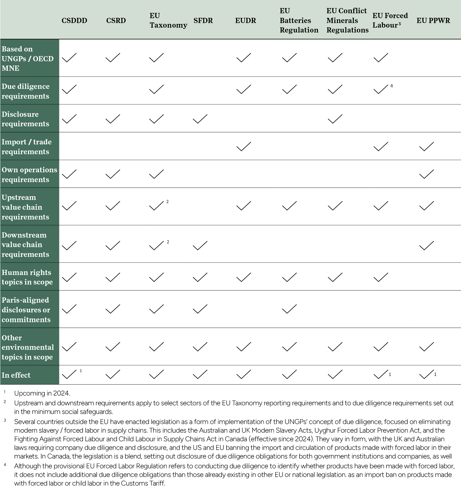 The table below summarizes how the CSDDD compares to other sustainability and due diligence regulations currently or soon to be in effect in the European Union.